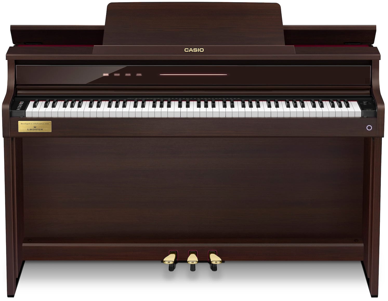 Casio AP-750 Celviano i brun er et luksuriøst hybridklaver, der forener ægte akustisk klaverfornemmelse med avanceret digital teknologi.