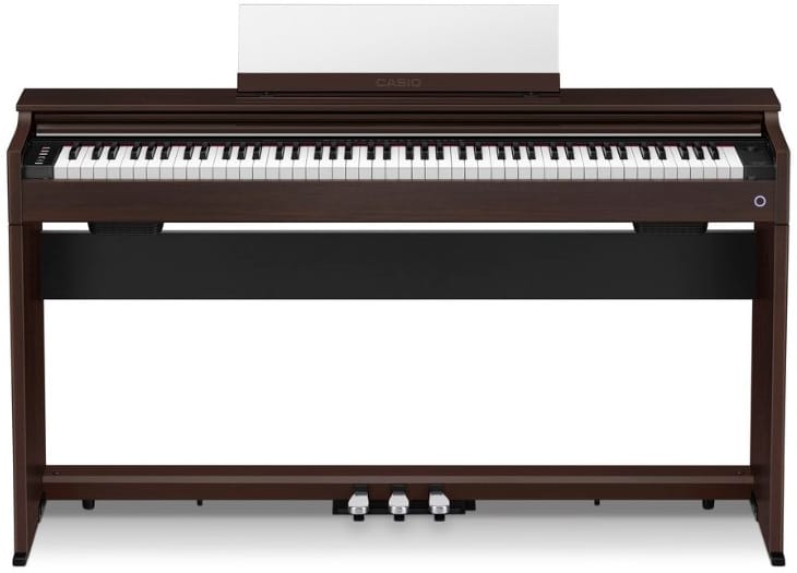 Her får du et elegant el-klaver i brun træfinish, der kombinerer autentisk klaverfornemmelse med moderne funktioner og fyldig lyd til hjemmet og undervisning.